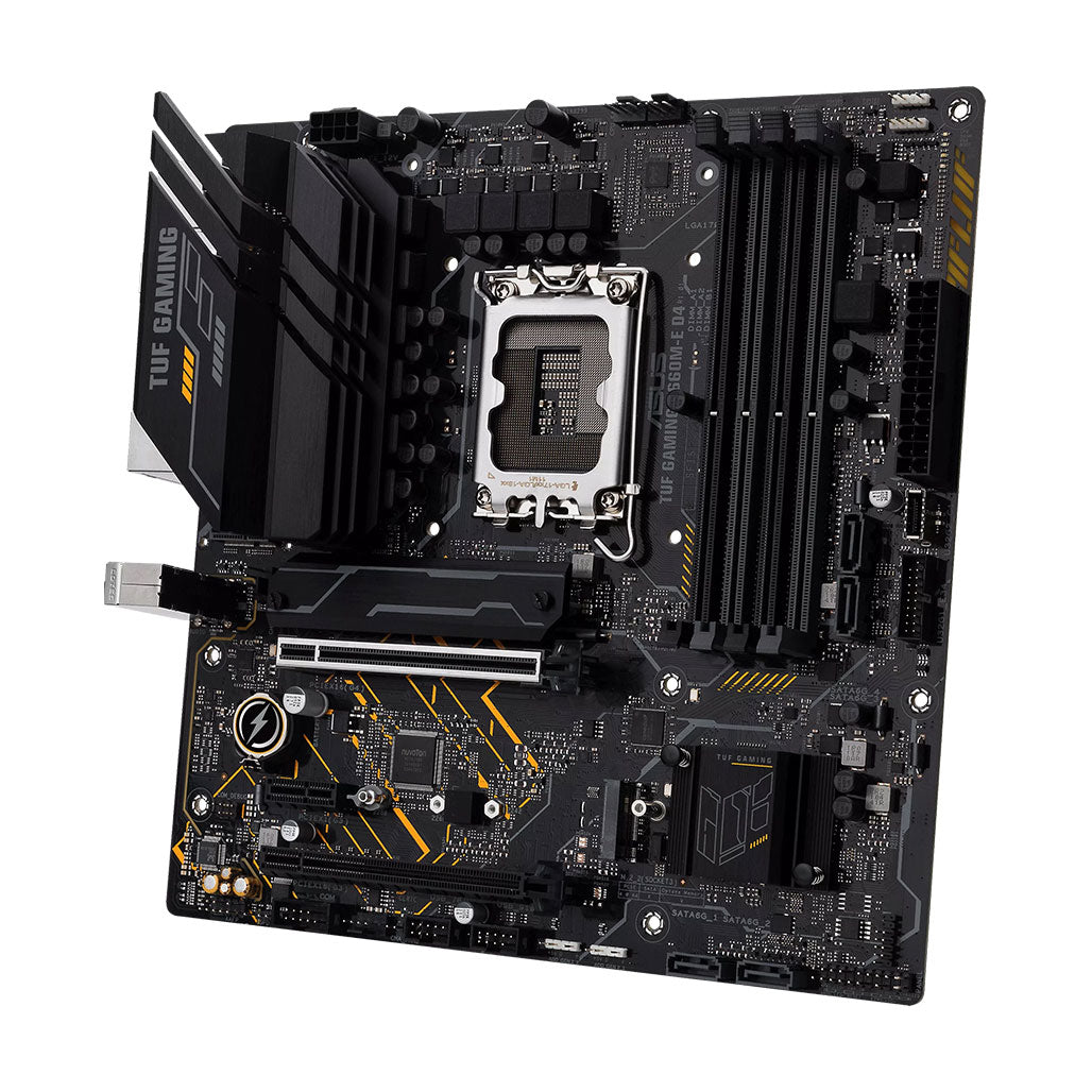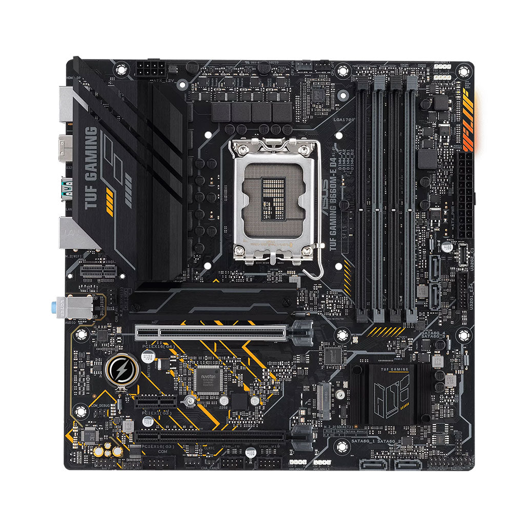 ASUS TUF GAMING B660M-E D4 takes all the essential elements of the latest Intel® processors and combines them with game-ready features and proven durability. Engineered with military-grade components, an upgraded power solution and a comprehensive cooling system, this motherboard offers rock-solid and stable performance for marathon gaming. Aesthetically, TUF GAMING B660M-E D4 sports the new TUF Gaming logo and incorporates simple geometric design elements to reflect the dependability and stability that defines the TUF Gaming series.